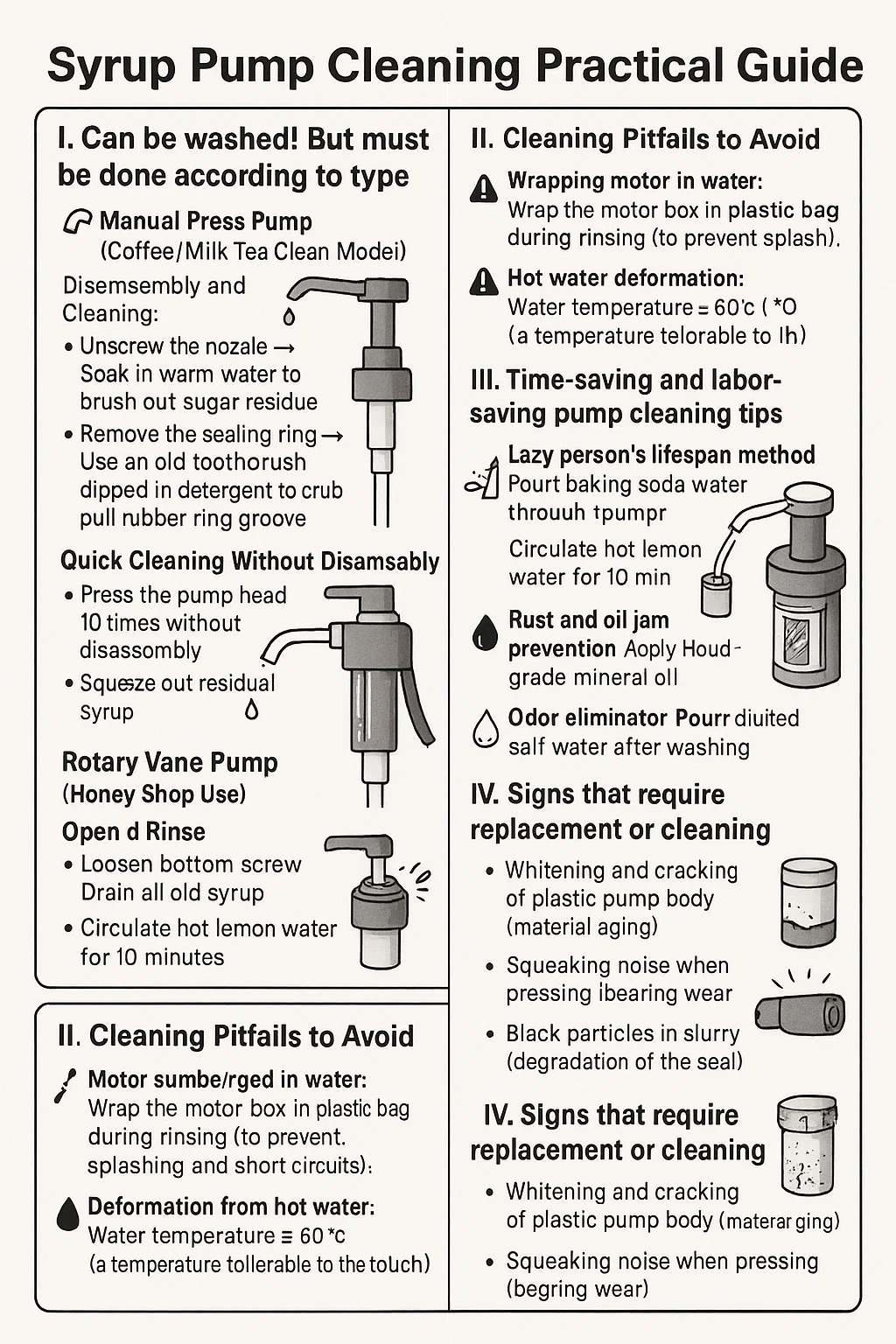Za tvrdokorne mrlje od šećera upotrijebite sušilo za kosu za zagrijavanje → omekšajte i lako isperite. Za ljepljive brtvene prstenove → pospite kukuruznim škrobom kako biste spriječili lijepljenje. Čuvajte rezervne pumpe u čistom maslinovom ulju.