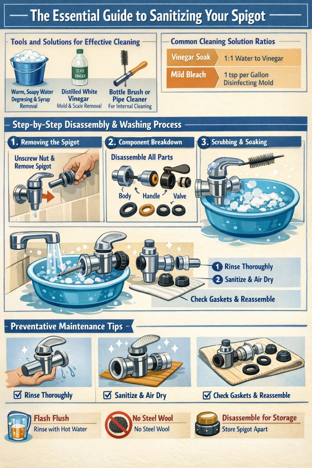 Za održavanje sigurnosti hrane i sprječavanje rasta štetnih bakterija, a napon za točenje pića treba dubinski očistiti nakon svake upotrebe ili barem jednom tjedno ako se koristi za običnu vodu. Budući da cijevi imaju zamršene unutarnje kanale, jednostavno ispiranje izvana nije dovoljno; potrebno je potpuno rastavljanje za uklanjanje ljepljivih ostataka šećera i spora plijesni koje rastu u tamnim, vlažnim okruženjima.