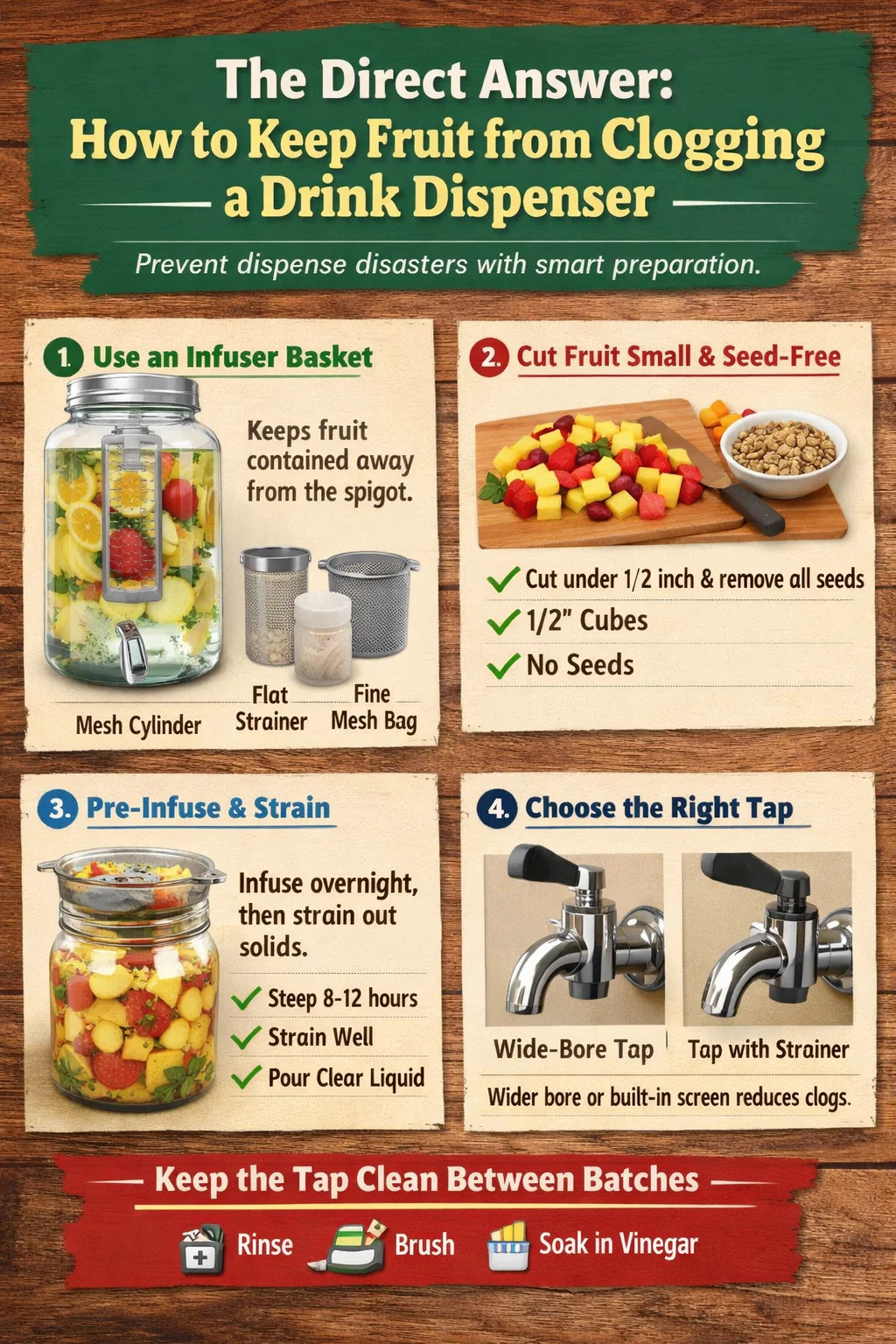 Najpouzdanije rješenje je držati voće fizički odvojenim od područja za točenje pomoću košare infuzera. Mnogi moderni aparati za doziranje pića dolaze s uklonjivim cilindrom za ubrizgavanje - mrežom ili perforiranom cijevi koja drži voće u sredini ili gornjem dijelu staklenke. Tekućina prolazi kroz mrežu i preuzima okus, ali čvrsti komadići nikada ne dopiru do slavine.