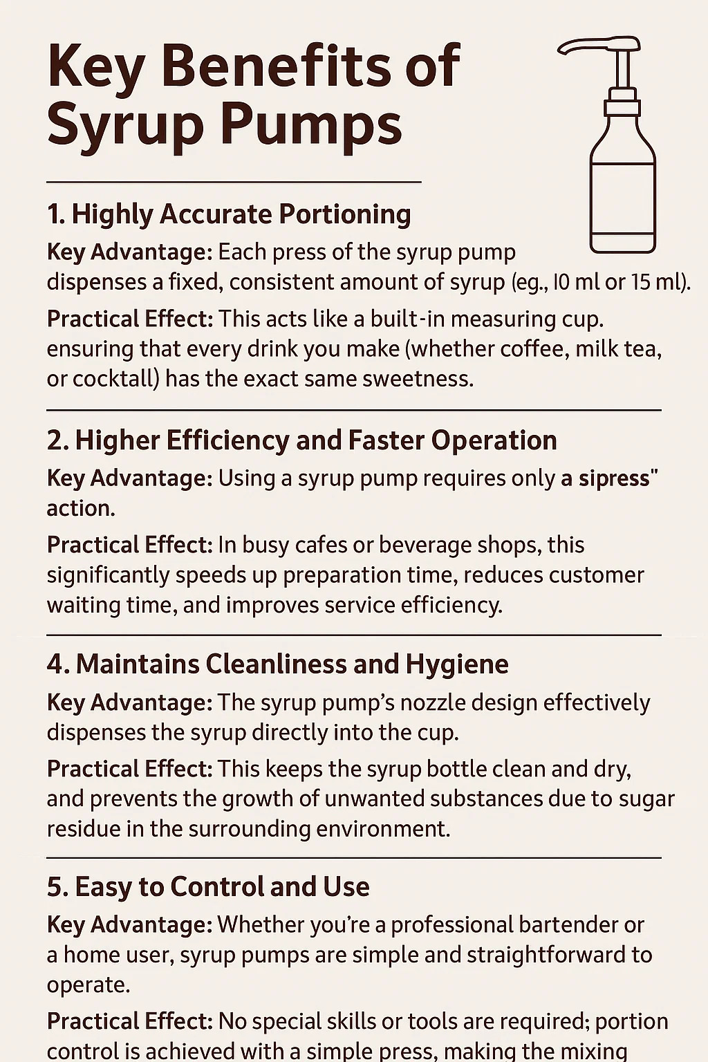 Ključna prednost: korištenje pumpice za sirup zahtijeva samo jednu radnju **"pritiska"**, eliminirajući više koraka kao što su otvaranje čepa boce, točenje, pronalaženje mjerne posude i zatim zatvaranje čepa.