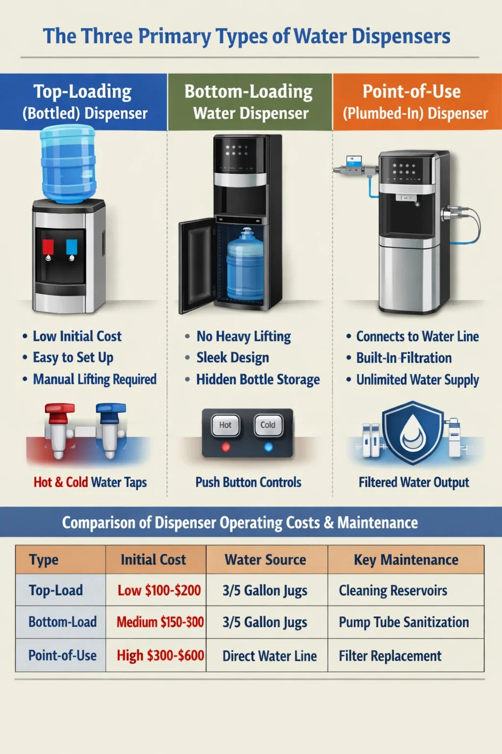 Kada se ocjenjuju rješenja za hidrataciju za dom ili ured, dispenzeri vode općenito se kategoriziraju u tri različite vrste na temelju mehanizma za punjenje i izvora vode: Dozatori s gornjim punjenjem (u bocama), dozatori s donjim punjenjem i dozatori na mjestu uporabe (priključni). Svaki sustav koristi specifičan slavina za dispenzer vode konfiguracija za upravljanje protokom, a odabir pravog ovisi o vašem fizičkom prostoru, proračunu i željenoj razini održavanja.
