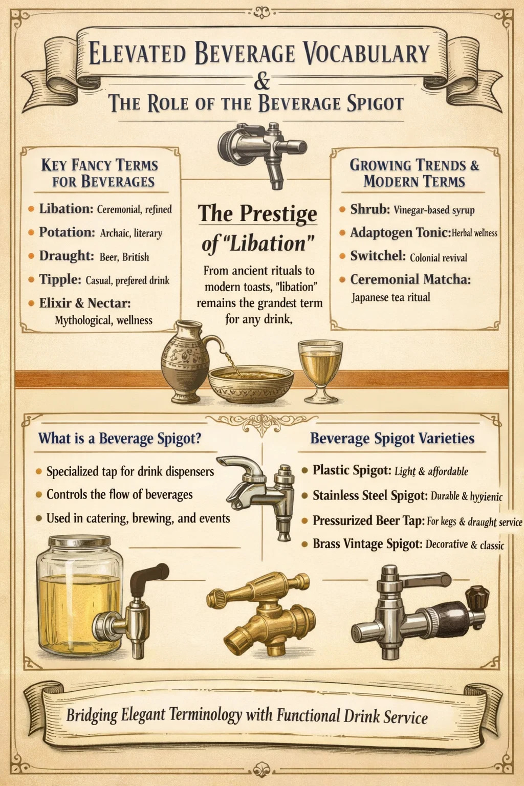 Svaki od ovih primjera pokazuje kako funkcionalna pića dobivaju otmjena imena kulturnim posuđivanjem, povijesnim oživljavanjem ili namjernim brendiranjem. Temeljni ljudski impuls - da uzdignemo ono što pijemo jezikom koji označava brigu, tradiciju ili sofisticiranost - ostaje konstantan čak i kada se specifične riječi mijenjaju. A na kraju svake takve evolucije uvijek postoji slavina za piće negdje, pretakanje pića iz posude u čašu, premošćivanje jaza između umijećenog lijevanja i zadovoljnog ispijača.
